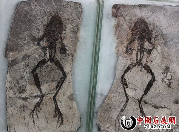 那两块化石上各有一只“青蛙”,两只“青蛙”体长6厘米,头部清晰可见,约占体长一半,其中一只青蛙左前爪和左后爪很清晰,另外一只则是右前爪和右后爪很清楚。在放大镜下,还能看到“青蛙”头部两侧各有一排整齐的梳状牙齿。