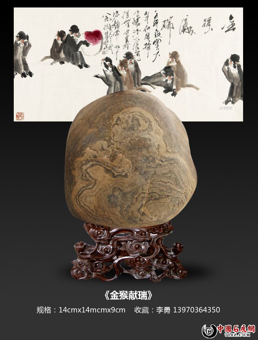 江西省上饶市市民李勇在家中端详一块酷似《金猴献瑞》的奇石,爱不释手。李先生是一位奇石爱好者,业余时间经常在山里河里寻找奇石。这块《金猴献瑞》奇石,其宽14公分,高14公分,厚9公分,图案写实逼真,头像轮廓完整清晰,纹理如白描线条流畅自然,五官与猴的头部特征如眉嵴突出、嘴巴前突、吻部前伸、鼻子扁平极为相似,神韵生动,不得不感叹大自然的鬼斧神工令人拍案叫绝。 规格:14cmx14cmx9cm 收藏者:李勇 电话:13970364350 |