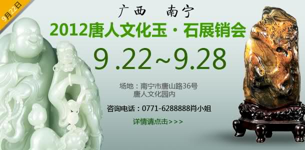 “2012唐人文化玉·石展销会”是“2012·南宁市西乡塘区香蕉文化旅游美食节暨第四届唐人文化节”中的重头戏。本次展销会面积设展位200余个(3m×3m)。本次展销会制定了全方位的媒介宣传计划,力争把本次展销会打造成区内专业性最强、规模最大、影响最广、效益最佳的玉石展销平台。7 y! O% y1 {" i